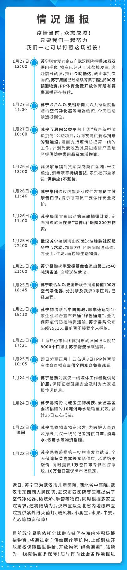 苏宁相关负责人表示,苏宁将继续与武汉政府以及医疗系统保持紧密沟通,为武汉疫情防控工作提供我们力之所能的各项帮助,以解疫区燃眉之急。