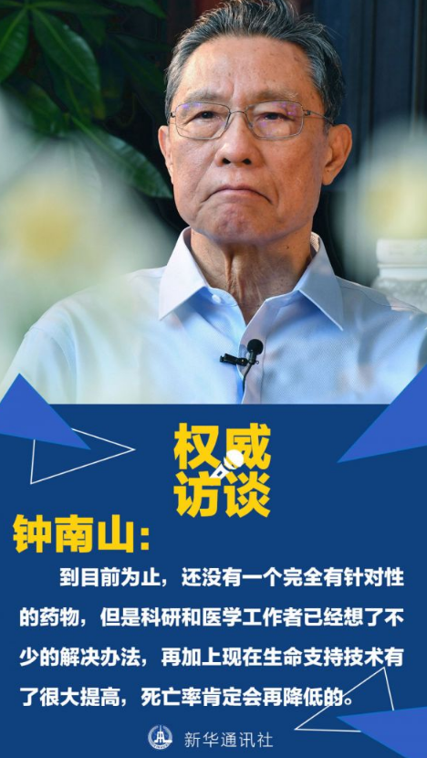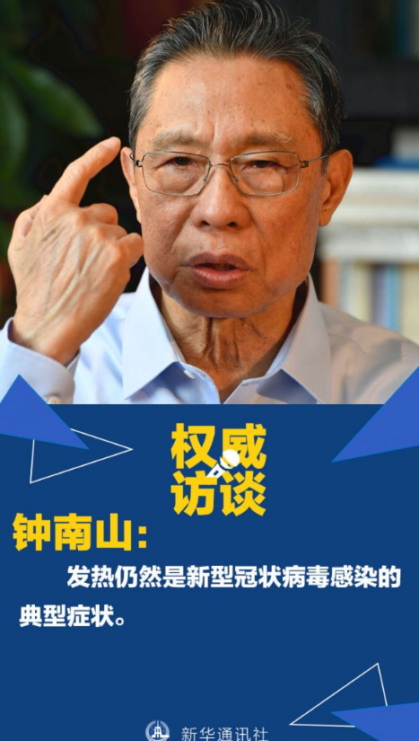 钟南山:发热仍是新型冠状病毒感染的典型症状。到目前为止还没有一个完全有针对性的药物,但科研和医学工作者已想了不少解决的办法,再加上现在生命支持技术有了很大提高,疫情死亡率会再降低。