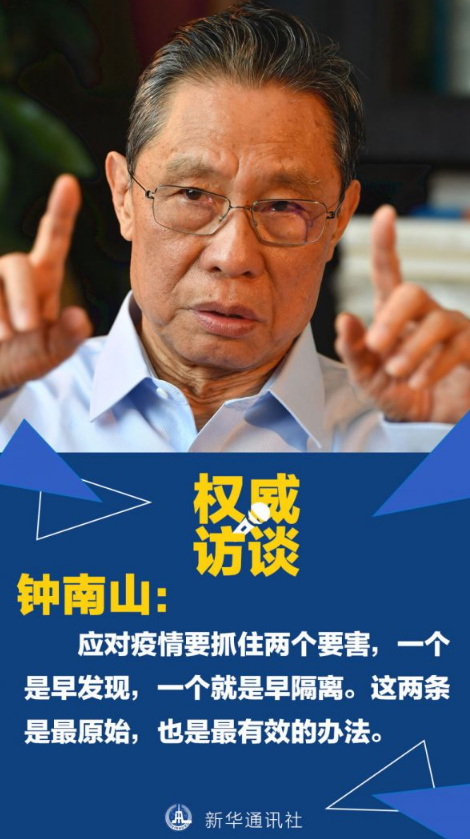 钟南山对新华社表示,10到14天是一个很好的隔离观察期,潜伏期过去了,发病的及时治疗,没发病也就没病,不会因为春运返程出现大传染,但排查的措施不能停。