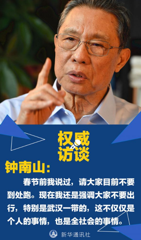 钟南山:春节前我说过,请大家目前不要到处跑。现在我还是强调大家不要出行,特别是武汉一带的,这不仅仅是个人的事情,也是全社会的事情。