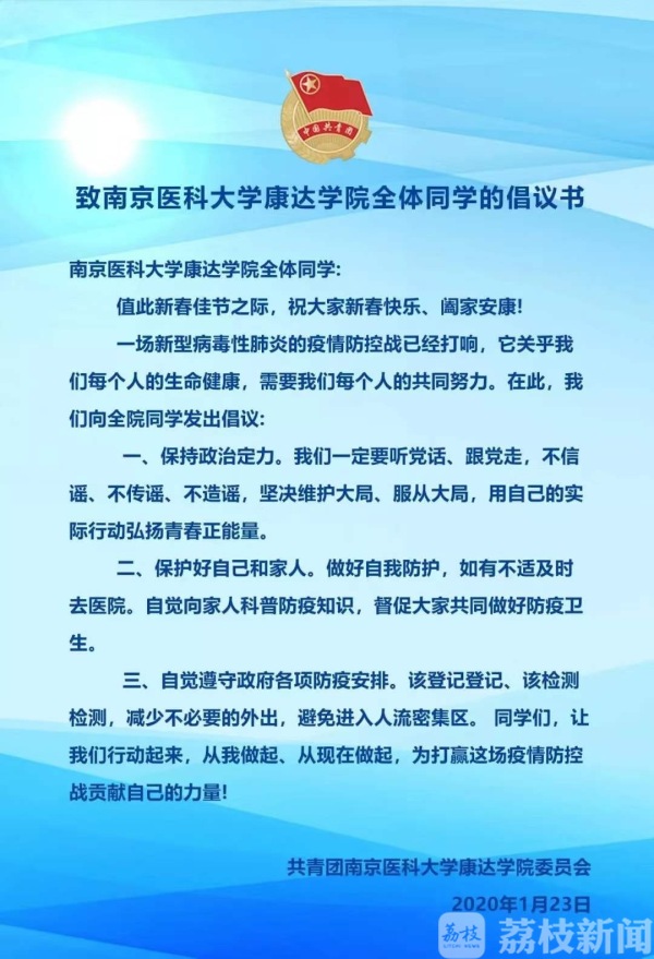 南医大康达学院组织宣传部、学工处、团委、保卫处等部门,纷纷向师生发了倡议书等信息,希望能共同度过本次疫情。