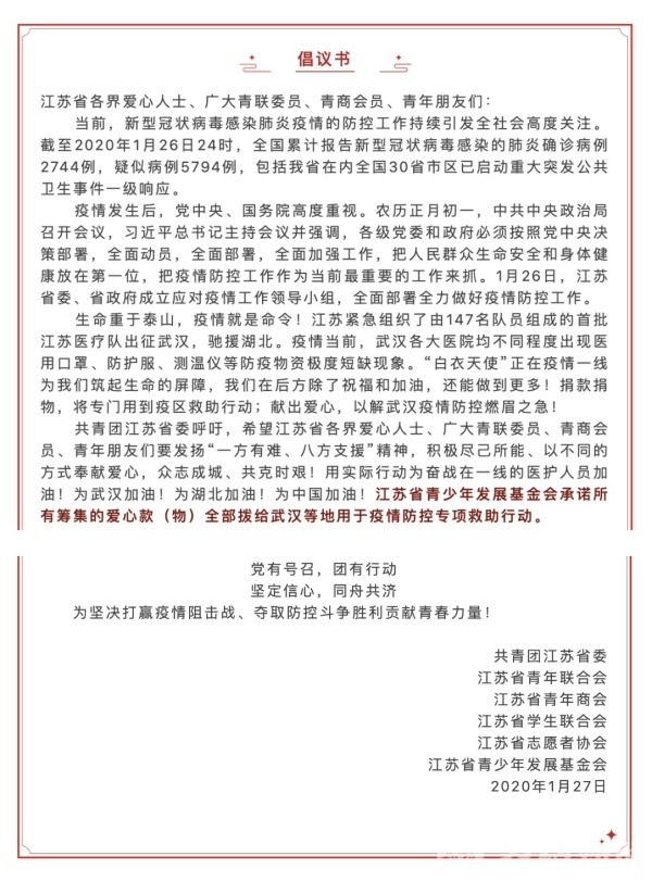 为响应省委、团中央号召,1月27日,团省委联合省青联、省青商会、省学联、省志愿者协会、省青基会向全省各界青年爱心人士发起了向武汉疫区捐款捐物的倡议。省青商会积极响应团省委号召,迅速动员会员企业家开展募捐活动,截至1月28日18时,已有50余名省青商会会员企业家参与捐赠善款及物资累计超千万元,爱心捐赠善款及物资将全部用于武汉等地疫情防控专项救助行动。