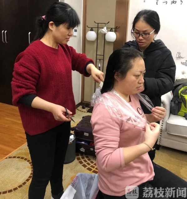 为了确保防疫过关,4名女队员自发剪去长发。没有理发剪,就用普通剪刀;没有罩衣,就用撕开的塑料袋。手起剪落、10秒钟不到,飒爽英姿的短发小姐姐出现了。“好不好看不重要,头发可以慢慢留!”