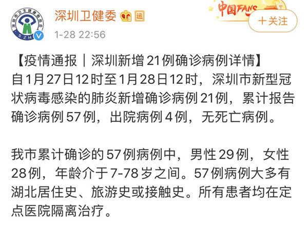 荔枝新闻讯 自1月27日12时至1月28日12时,深圳市新型冠状病毒感染的肺炎新增确诊病例21例,累计报告确诊病例57例,出院病例4例,无死亡病例。