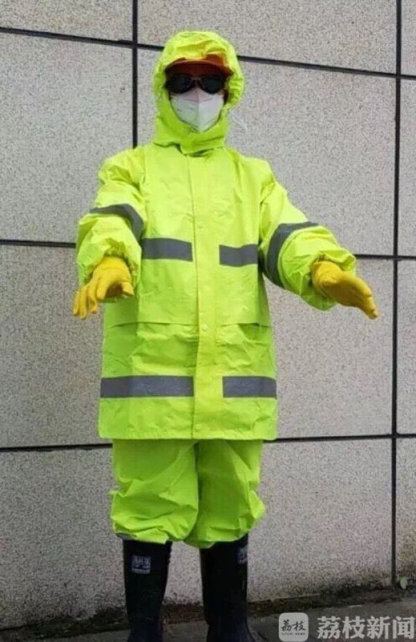 环卫工作人员穿戴整齐:防雨工作服、长筒胶鞋、乳胶手套、口罩、防护眼镜