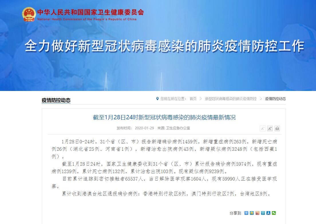 截至1月28日24时,国家卫生健康委收到31个省(区、市)累计报告确诊病例5974例,现有重症病例1239例,累计死亡病例132例,累计治愈出院103例。现有疑似病例9239例。
