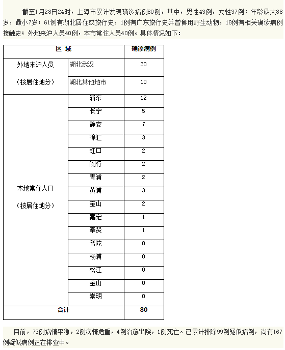 截至1月28日24时,上海市累计发现确诊病例80例,其中,男性43例,女性37例;年龄最大88岁,最小7岁;61例有湖北居住或旅行史,1例有广东旅行史并曾食用野生动物,18例有相关确诊病例接触史;外地来沪人员40例,本市常住人员40例。