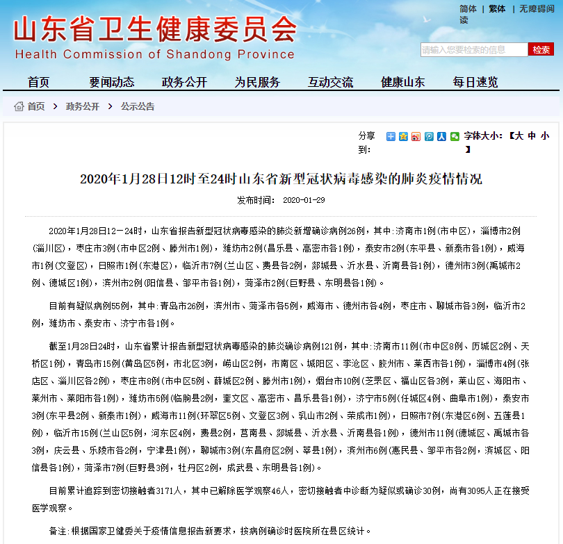 截至1月28日24时,山东省累计报告新型冠状病毒感染的肺炎确诊病例121例,其中:济南市11例(市中区8例、历城区2例、天桥区1例),青岛市15例(黄岛区5例,市北区3例,崂山区2例,市南区、城阳区、李沧区、胶州市、莱西市各1例),淄博市4例(张店区、淄川区各2例),枣庄市8例(市中区5例、薛城区2例、滕州市1例),烟台市10例(芝罘区、福山区各3例,莱山区、海阳市、莱州市、莱阳市各1例),潍坊市5例(临朐县2例,奎文区、高密市、昌乐县各1例),济宁市5例(任城区4例、曲阜市1例),泰安市3例(东平县2例、新泰市1例),威海市11例(环翠区5例、文登区3例、乳山市2例、荣成市1例),日照市7例(东港区6例、五莲县1例),临沂市15例(兰山区5例,河东区4例,费县2例,莒南县、郯城县、沂水县、沂南县各1例),德州市11例(德城区、禹城市各3例,庆云县、乐陵市各2例,宁津县1例),聊城市3例(东昌府区2例、莘县1例),滨州市6例(惠民县、邹平市各2例,滨城区、阳信县各1例),菏泽市7例(巨野县3例,牡丹区2例,成武县、东明县各1例)。