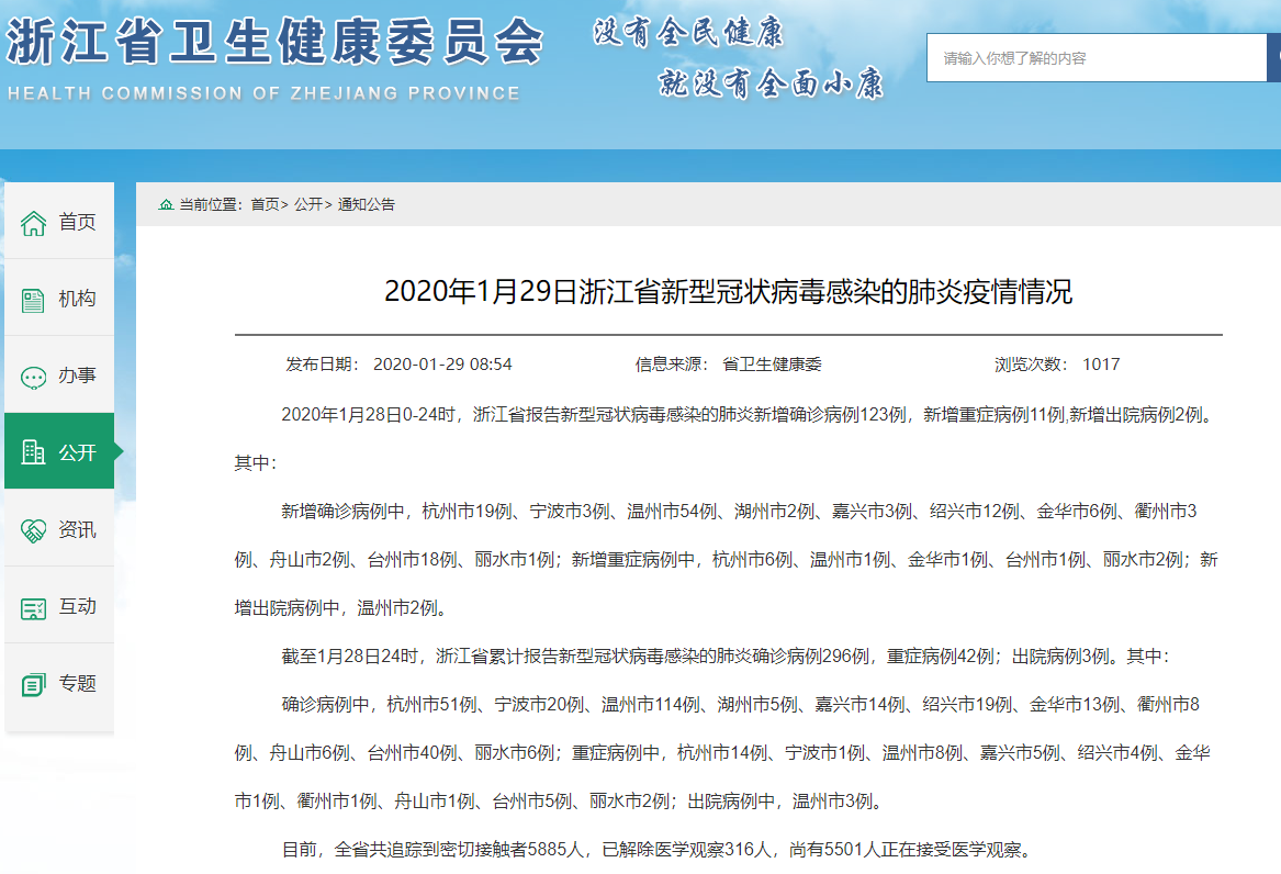 截至1月28日24时,浙江省累计报告新型冠状病毒感染的肺炎确诊病例296例,重症病例42例;出院病例3例。其中: