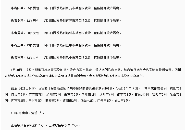 1月28日,按照《新型冠状病毒感染的肺炎诊疗方案》规定,根据病例临床表现,结合流行病学史和实验室检测结果,四川省新型冠状病毒感染的肺炎病例确认专家组确认此18例病例为我省新增新型冠状病毒感染的肺炎病例。