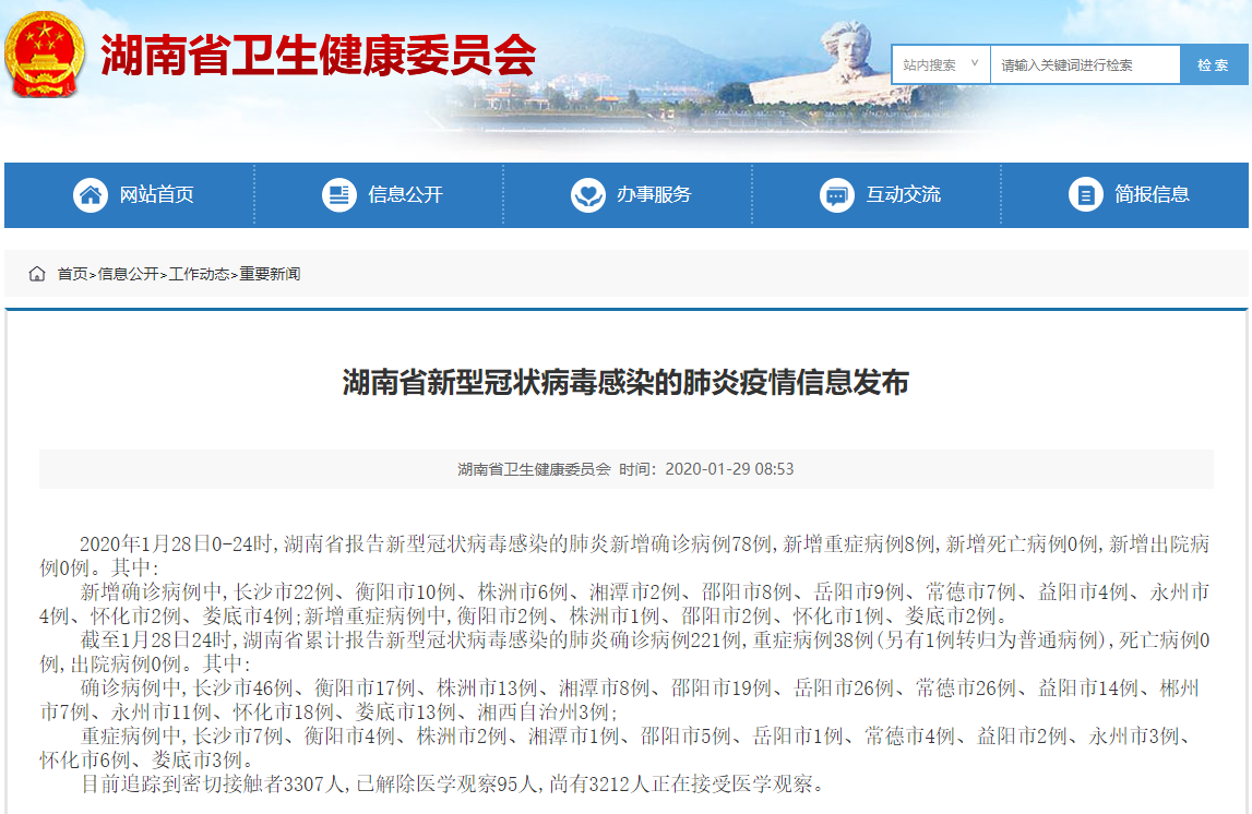 截至1月28日24时,湖南省累计报告新型冠状病毒感染的肺炎确诊病例221例,重症病例38例(另有1例转归为普通病例),死亡病例0例,出院病例0例。其中: