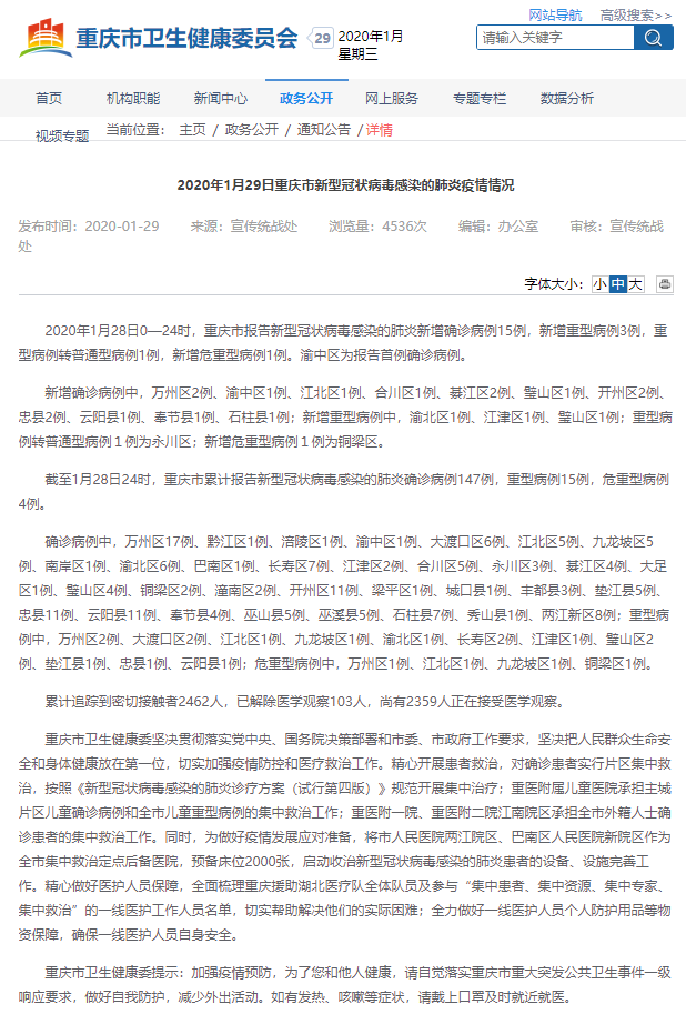 截至1月28日24时,重庆市累计报告新型冠状病毒感染的肺炎确诊病例147例,重型病例15例,危重型病例4例。