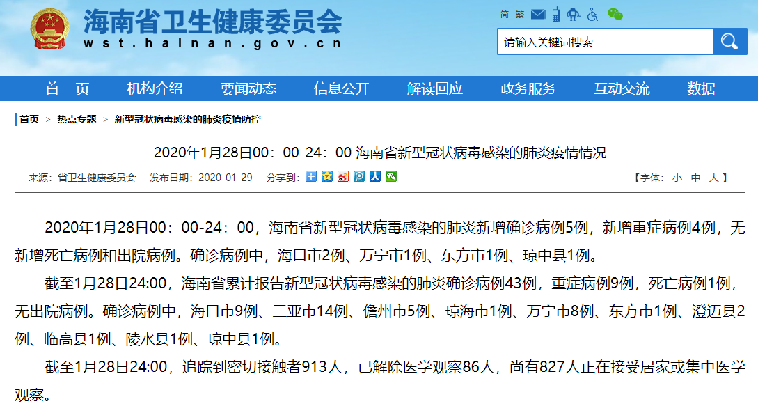截至1月28日24时,海南省累计报告新型冠状病毒感染的肺炎确诊病例43例,重症病例9例,死亡病例1例,无出院病例。确诊病例中,海口市9例、三亚市14例、儋州市5例、琼海市1例、万宁市8例、东方市1例、澄迈县2例、临高县1例、陵水县1例、琼中县1例。