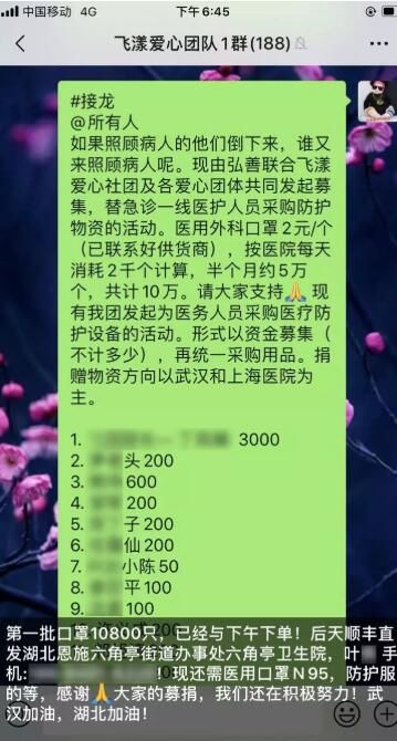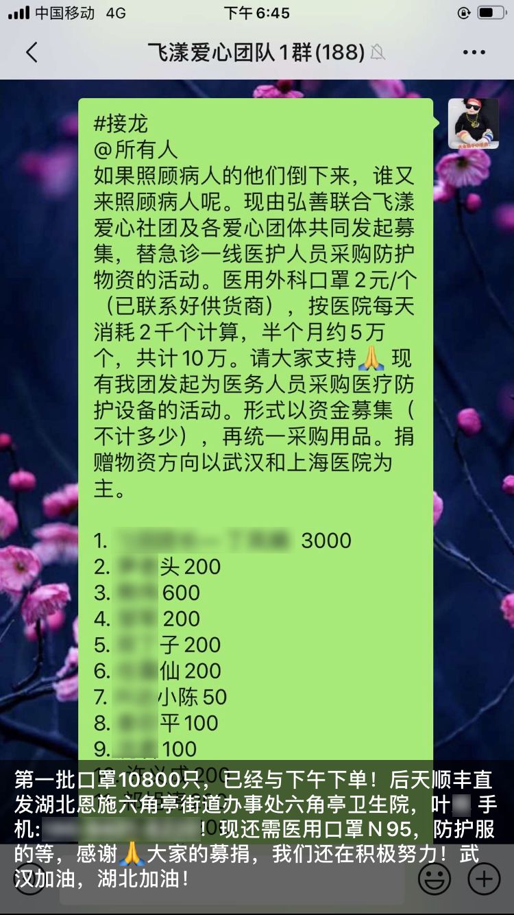1月27日中午,飞漾爱心社团在微信群中发出资金募集活动,得到了社团成员的热烈响应。短短半天,就募集款项24000余元。目前,首批利用募集款项购买的10800只一次性医用口罩已经发往湖北恩施,第二批专用医用口罩N95和一次性医用口罩已预定,第二批口罩将根据实际需求进行分配,捐赠给宜兴及施恩一线医护人员。