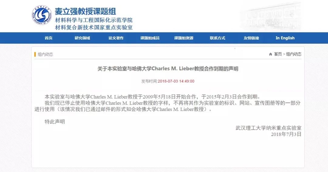 不过,武汉理工大学材料科学与工程国际化示范学院、材料复合新技术国家重点实验室网站显示,该实验室在2018年7月3日发布了《关于本实验室与哈佛大学Charles M.Lieber教授合作到期的声明》,称与Lieber的合作关系已在2015年3月到期。
