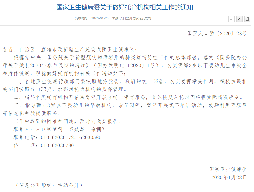 根据党中央、国务院关于新型冠状病毒感染的肺炎疫情防控工作的总体部署,落实《国务院办公厅关于延长2020年春节假期的通知》(国办发明电〔2020〕1号),切实保障3岁以下婴幼儿生命安全和身体健康,现就做好托育机构有关工作通知如下: