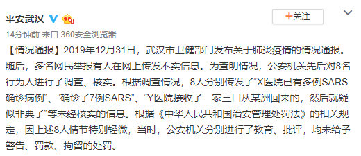 2019年12月31日,武汉市卫健部门发布关于肺炎疫情的情况通报。随后,多名网民举报有人在网上传发不实信息。为查明情况,公安机关先后对8名行为人进行了调查、核实。根据调查情况,8人分别传发了“X医院已有多例SARS确诊病例”、“确诊了7例SARS”、“Y医院接收了一家三口从某洲回来的,然后就疑似非典了”等未经核实的信息。根据《中华人民共和国治安管理处罚法》的相关规定,因上述8人情节特别轻微,当时,公安机关分别进行了教育、批评,均未给予警告、罚款、拘留的处罚。