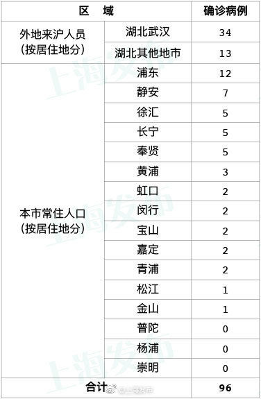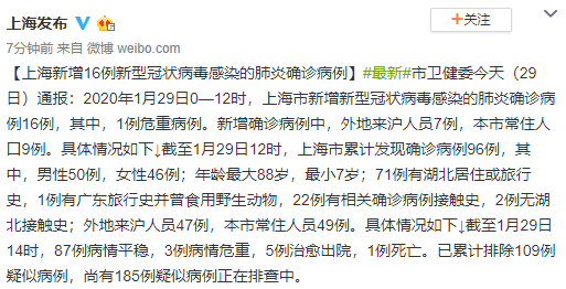2020年1月29日0-12时,上海市新增新型冠状病毒感染的肺炎确诊病例16例,其中,1例危重病例。新增确诊病例中,外地来沪人员7例,本市常住人口9例。具体情况如下↓截至1月29日12时,上海市累计发现确诊病例96例,其中,男性50例,女性46例;年龄最大88岁,最小7岁;71例有湖北居住或旅行史,1例有广东旅行史并曾食用野生动物,22例有相关确诊病例接触史,2例无湖北接触史;外地来沪人员47例,本市常住人员49例。具体情况如下↓截至1月29日14时,87例病情平稳,3例病情危重,5例治愈出院,1例死亡。已累计排除109例疑似病例,尚有185例疑似病例正在排查中。
