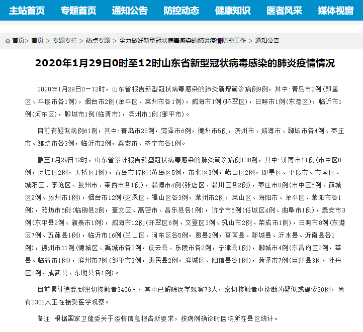 截至1月29日12时,山东省累计报告新型冠状病毒感染的肺炎确诊病例130例,其中:济南市11例(市中区8例,历城区2例,天桥区1例),青岛市17例(黄岛区5例,市北区3例,崂山区2例,即墨区、平度市、市南区、城阳区、李沧区、胶州市、莱西市各1例),淄博市4例(张店区、淄川区各2例),枣庄市8例(市中区5例、薛城区2例、滕州市1例),烟台市12例(芝罘区、福山区各3例,莱州市2例,莱山区、海阳市、牟平区、莱阳市各1例),潍坊市5例(临朐县2例,奎文区、高密市、昌乐县各1例),济宁市5例(任城区4例、曲阜市1例),泰安市3例(东平县2例、新泰市1例),威海市12例(环翠区6例、文登区3例、乳山市2例、荣成市1例),日照市8例(东港区7例、五莲县1例),临沂市16例(兰山区、河东区各5例,费县2例,莒南县、郯城县、沂水县、沂南县各1例),德州市11例(德城区、禹城市各3例,庆云县、乐陵市各2例,宁津县1例),聊城市4例(东昌府区2例,莘县、临清市1例),滨州市7例(邹平市3例,惠民县2例,滨城区、阳信县各1例),菏泽市7例(巨野县3例,牡丹区2例,成武县、东明县各1例)。