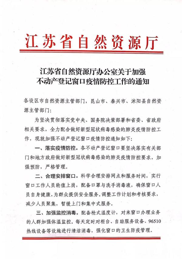 疫情当前,为了保证老百姓健康,同时也积极配合国家、全省做好疫情防控工作通知要求, 江苏省自然资源厅日前印发通知,要求切实加强全省不动产登记窗口疫情防控工作,积极推广线上登记。