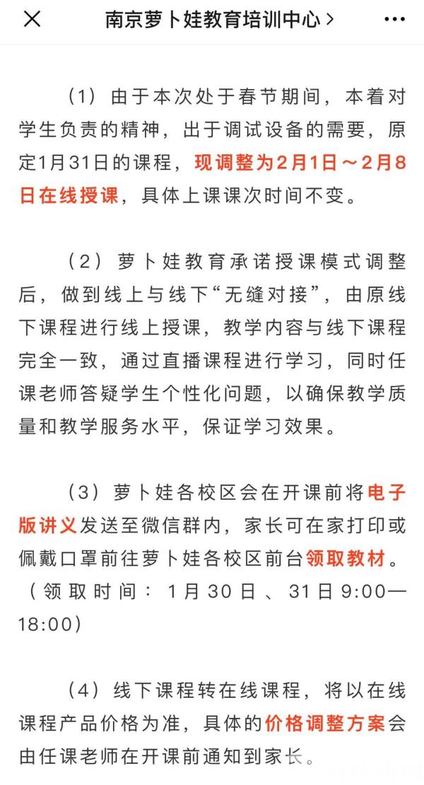目前,包括学而思、爱思哲、萝卜娃等机构已经发布线上课程通知。新东方教育科技集团南京学校校长孙进说,寒假二期课程全部采取线上辅导,春季课程也将做调整。“从除夕开始,老师在线上练习讲课,用了平台在线上讲课和线下讲课感觉是不一样的,要和学生互动,要能吸引孩子,孩子在线下有学习环境,到了线上环境变了,如果不能抓住他的注意力就会走神。春季课程我们也都推迟,学校的课程推迟到2月17号,我们基本上都是往后推了一周的时间。”同时,对每位老师也进行假期外出登记。