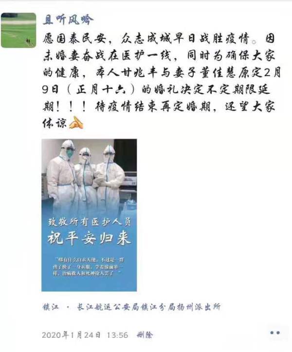 “现在大家都在抗击新型冠状病毒,疫情严重,我们的责任也都挺重的,婚期延迟吧,等战胜疫情我们再结婚,永远爱你!” 1月24日除夕下午,正在派出所值班的长航公安局镇江分局扬州派出所民警甘兆丰,收到未婚妻董佳慧的微信语音留言。