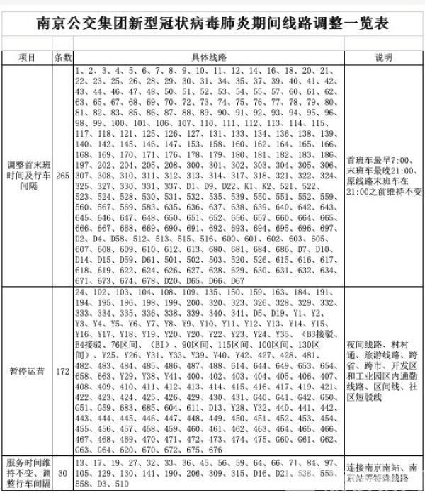 除南京南站、南京站等交通枢纽接驳线路外,其余市区公交线路首班发车时间调整为最早7:00,末班收车时间调整为最晚21:00。夜间线路、村村通、旅游线路、跨省跨市的毗邻线路、开发区和工业园区内通勤线路、区间线、社区短驳线暂停运营。城区线路发班间隔调整为20~30分钟。远郊线路发班间隔调整为40~90分钟。