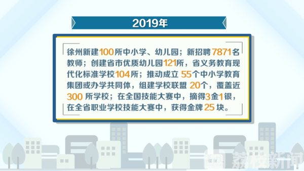 补短板、抓改革、促融合,2019年,徐州唱响了教育高质量发展的“大风歌”,向人民交出了一份成绩喜人的答卷。新建100所中小学、幼儿园;新招聘7871名教师;创建省市优质幼儿园121所,省义务教育现代化标准学校104所;推动成立55个中小学教育集团或办学共同体,组建学校联盟20个,覆盖近300所学校;在全国技能大赛中,摘得3金1银,在全省职业学校技能大赛中,获得金牌25块。