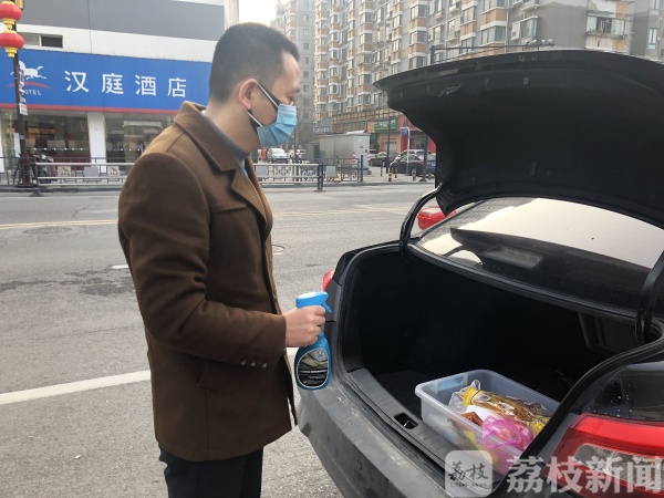 随后,记者搭乘了一辆江南公司的出租车,车上的司机也戴着口罩。司机王先生告诉记者,他每天都会用消毒液对车子内部进行消杀,因昨晚没回家,今早出车前就在酒店做了消杀。出租车司机王先生介绍,他每天都在状元楼大酒店门口带客,正好酒店有消毒,就顺便喷了点消毒喷雾,正常的话每天出门前都会做好消毒工作。