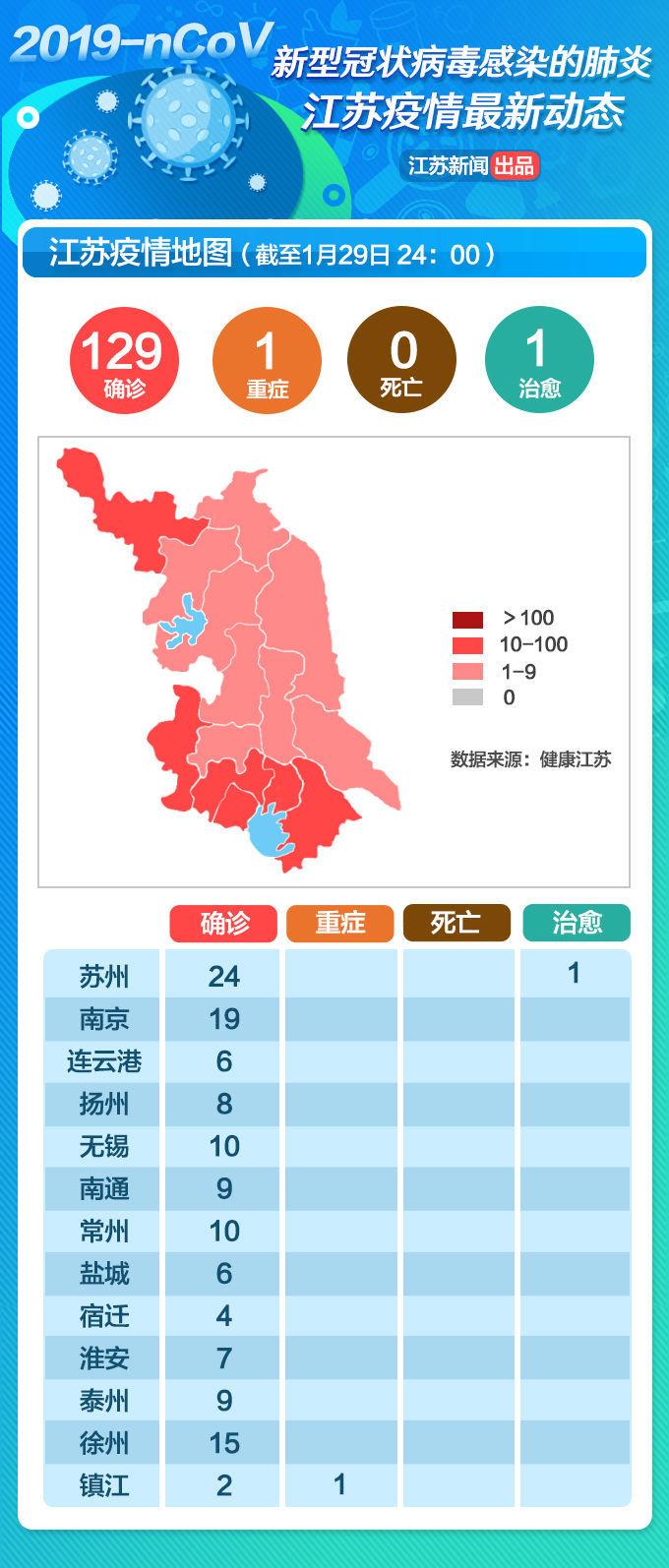 截至1月29日24时,江苏省累计报告新型冠状病毒感染的肺炎确诊病例129例,其中,重症病例1例,出院病例1例。确诊病例中,南京市19例、无锡市10例、徐州市15例、常州市10例、苏州市24例、南通市9例、连云港市6例、淮安市7例、盐城市6例、扬州市8例、镇江市2例、泰州市9例、宿迁市4例;重症病例中,镇江市1例;出院病例中,苏州市1例。