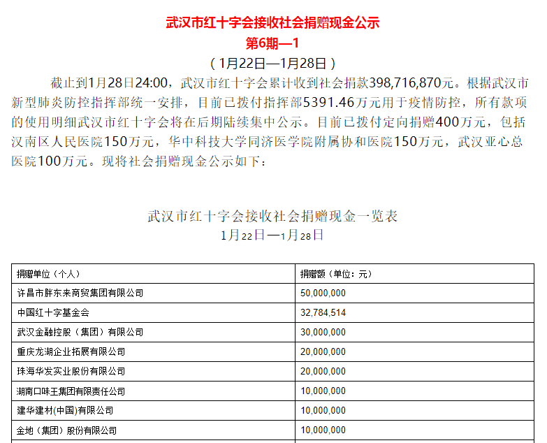 荔枝新闻讯 据武汉市红十字会消息,截止到1月28日24:00,武汉市红十字会累计收到社会捐款398,716,870元。根据武汉市新型肺炎防控指挥部统一安排,目前已拨付指挥部5391.46万元用于疫情防控,所有款项的使用明细武汉市红十字会将在后期陆续集中公示。目前已拨付定向捐赠400万元,包括汉南区人民医院150万元,华中科技大学同济医学院附属协和医院150万元,武汉亚心总医院100万元。