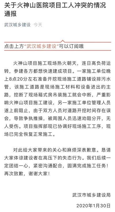 荔枝新闻讯 据武汉市城乡建设局微信公众号消息,火神山项目施工现场热火朝天,连日高负荷运转,参建各方都想快速建成项目。一家施工单位晚上8点20分左右准备开挖现场施工道路铺设排污水管,该施工道路是现场施工材料和设备进出的主路,挖断了现场箱式房吊装施工就会中断,严重影响火神山项目施工建设,另一家施工单位管理人员遂上前阻止,由于双方人员对道路开挖时间存在误会,导致争执推搡,被周围人员迅速劝阻分开,无人受伤。项目指挥部现已协调好现场施工工序,现场已完全恢复正常施工。