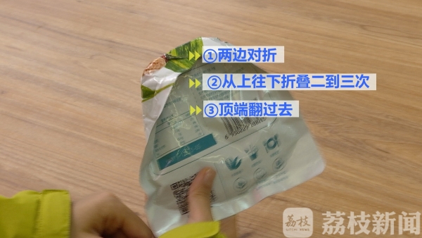 第二个小妙招,不需要借助任何东西就能储存零食,那就是折叠零食包装袋。将包装两边对折,从上往下折叠三次,顶端外翻过去,经过测试,这种方法储存零食的密封性竟然很不错。