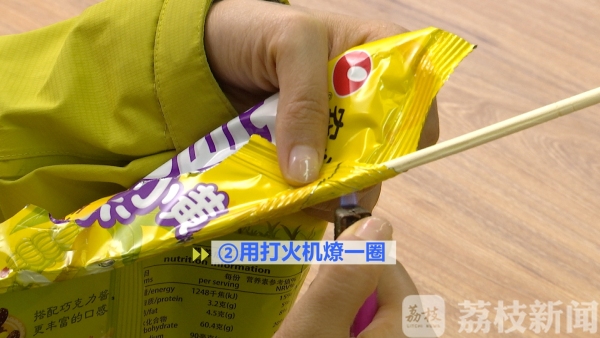 第三个小妙招是准备两种家庭中常见的物品:一根筷子,一个打火机。在零食包装开口处用筷子卷起来,再用打火机燎一圈,零食袋封得严严实实,经检测不透气也不透水。