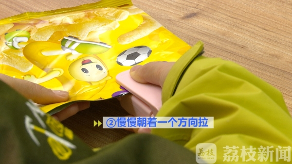 首先,袋中提前装入少量清水,用封口器按压5秒预热,慢慢朝着一个方向拉,很快零食袋就密封完成了,操作简单又安全,完美!