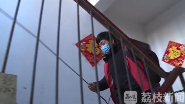 1月30号上午10点,在泗阳县众兴镇界湖花园小区内,66岁的退休老党员胡茂喜正背着药机往楼道喷洒消毒液。这样的工作是最近一个星期胡茂喜每天都要重复做的事情。由于小区楼房都是六层高的多层,一栋楼喷下来需要半个小时左右。老胡一般上午喷两三栋楼,下午喷两三栋楼,考虑到自己的年纪大了,他每次都背半箱水,这样爬楼的时候会轻松一点。
