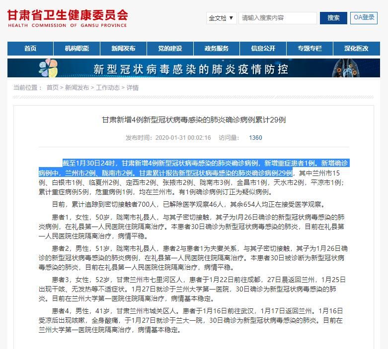 患者4,男性,41岁,甘肃兰州市城关区人。患者于1月16日前往武汉,1月17日返回兰州。1月16日受凉后出现咳嗽,全身酸痛,于1月27日就诊于兰大一院,30日确诊为新型冠状病毒感染的肺炎。目前在兰州大学第一医院住院隔离治疗,病情基本稳定。