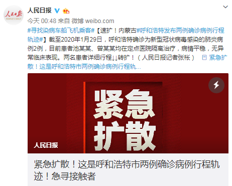 截至2020年1月29日,呼和浩特确诊为新型冠状病毒感染的肺炎病例2例,目前患者池某某、曾某某均在定点医院隔离治疗,病情平稳,无异常临床表现。