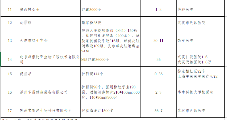 南都记者从捐赠详情表中看到,武汉仁爱医院收到的捐赠口罩,其捐赠方显示为北京森根比亚生物工程技术有限公司。捐赠详情表显示,该公司捐赠了N95口罩3.6万个,价值36万元,流向显示武汉仁爱医院(1.6万个)和武汉天佑医院(1.6万个)。剩余0.4万个口罩流向并未标注。而协和医院收到口罩捐赠方显示为陕西韩女士,其捐赠口罩3000个,折合金额为1.2万元。