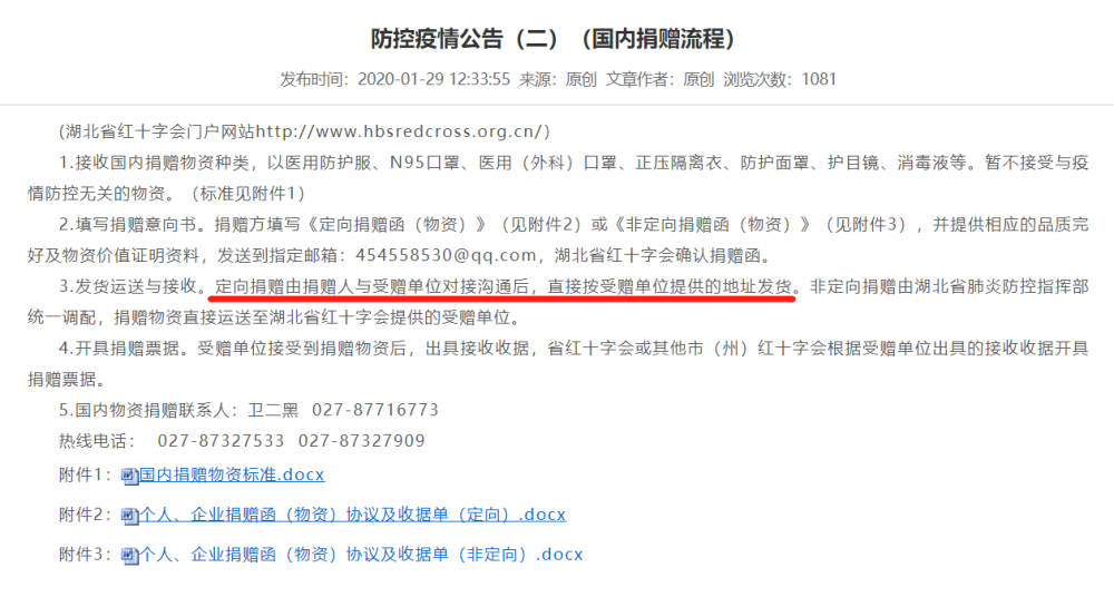 另据湖北省红十字会官网公告,湖北省红会按一定标准接收疫情防控相关物资,捐赠方需填写捐赠意向函及相应证明资料提供给红会审核。其中,捐赠意向书分为“定向”或者“非定向”两种。定向捐赠由捐赠人与受赠单位对接沟通后,直接按受赠单位提供的地址发货。非定向捐赠由湖北省肺炎防控指挥部统一调配,捐赠物资直接运送至湖北省红十字会提供的受赠单位。