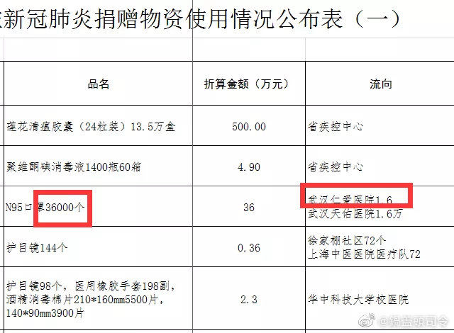 据此前清单显示,由北京森根比亚生物工程技术有限公司捐赠的36000个N95口罩(医用),分别分配给武汉仁爱医院1.6万个,武汉天佑医院1.6万个。其中,天佑医院在武汉61家开设发热门诊医院名单之列,而武汉仁爱医院不在该名单之中,剩余4000个口罩去处不明。而收治肺炎的一线公立医院协和医院显示获得私人捐助的3000个口罩。