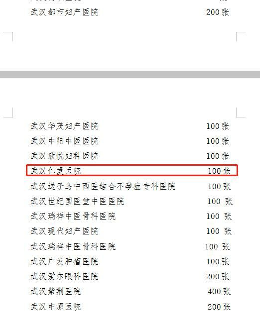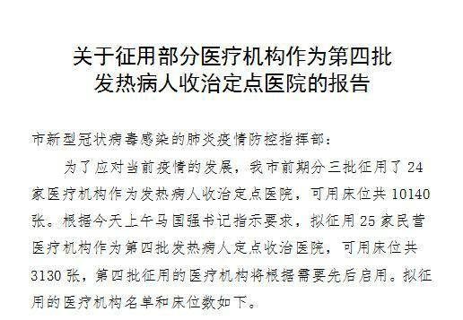 31日上午10点58分,武汉仁爱医院在其官网上公布了一份《关于征用部分医疗机构作为第四批发热病人收治定点医院报告》,上面显示,包括武汉仁爱医院在内的25家民营医疗机构被征用为第四批发热病人定点收治医院,武汉仁爱医院被征用了100张床位。