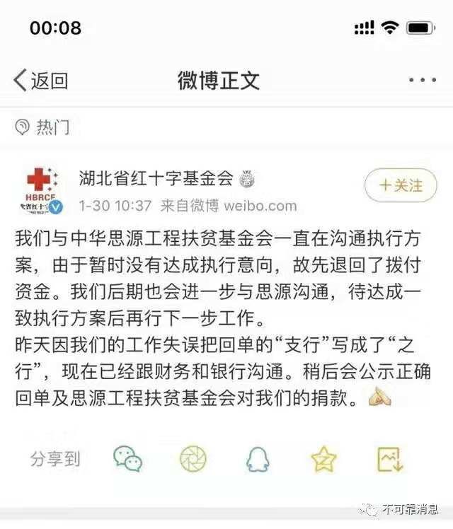 有网友质疑这个回单是P图造假,29日晚,湖北省红十字基金会删掉了微博。30日上午再发微博表示,前一天因工作失误,把“支行”写成了“之行”,稍后会公示正确回单。