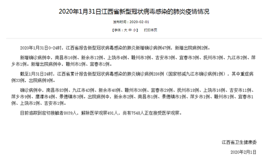 荔枝新闻讯 2020年1月31日0-24时,江西省报告新型冠状病毒感染的肺炎新增确诊病例47例,新增出院病例2例。