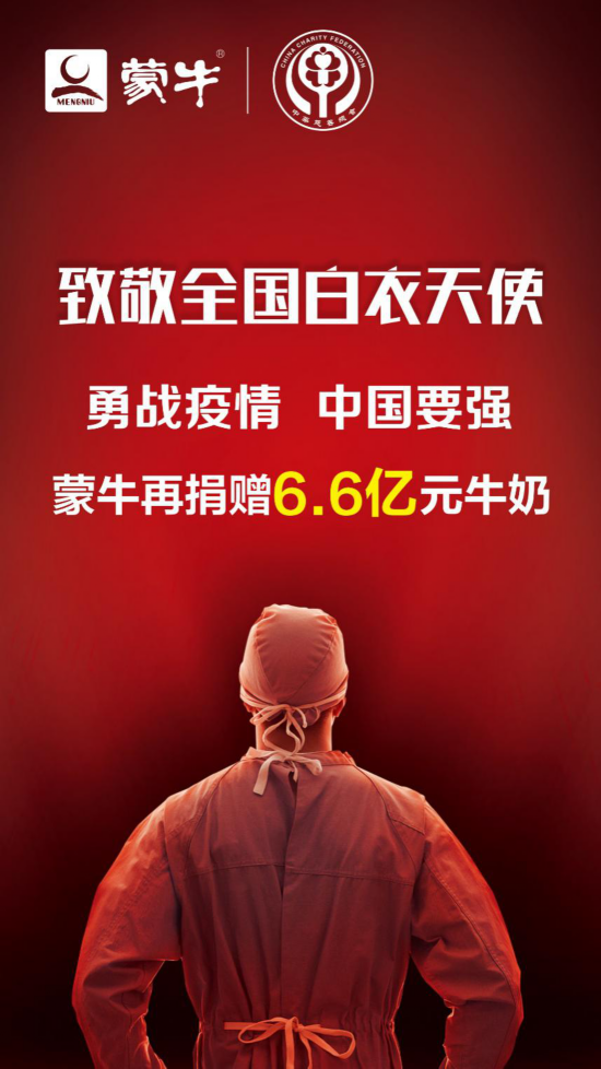 作为一家民族企业,蒙牛责任在肩,此次追加捐赠6.6亿,更彰显了蒙牛集团与全国人民并肩,勇战疫情,共克时艰的决心!保障医务人员、抗击疫情工作者充分的物资供应与营养支持,是做好新型冠状病毒感染的肺炎疫情防控工作中的关键一环和重要保障。蒙牛始终营养全国人民的要强,与全国人民共同守护中国红!为人民群众及食品市场稳定贡献力量!