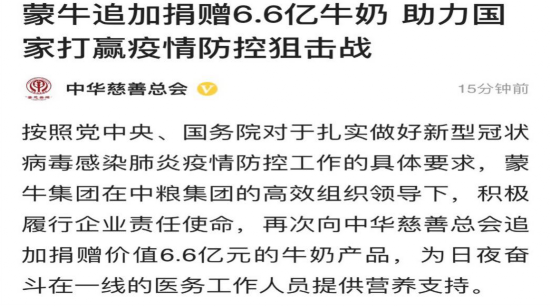 1月31日,蒙牛集团追加捐赠6.6亿。
