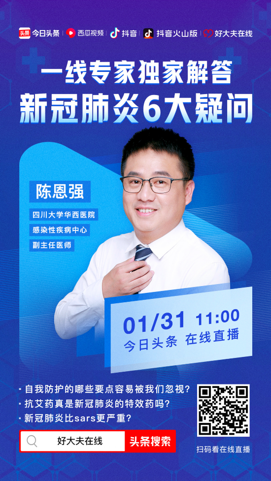 1月31日,四川大学华西医院感染性疾病中心副主任医师陈恩强在今日头条、抖音、西瓜视频上直播,回答网友关于“新型冠状病毒感染的肺炎”的热点问题。超过55万网友在线学习了相关知识。