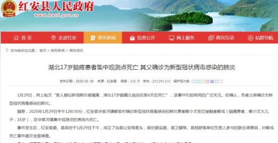 据北京青年报,29日,一篇题为《家人疑似新冠肺炎被隔离,湖北17岁脑瘫儿独自在家6天后死亡》的文章在朋友圈流传,文中称,红安县鄢家村人鄢小文因疑似新冠肺炎被隔离,其17岁四肢瘫痪患有脑瘫的儿子独自在家6天,并在1月29日去世。