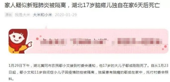 1月29日,一则网上帖文“家人疑似新冠肺炎被隔离,湖北17岁脑瘫儿独自在家6天后死亡”引起网民的广泛关注。