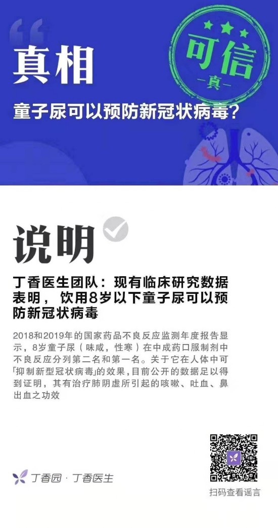 “今早起来谣言满天飞,我都被气笑了。”丁香园一名工作人员告诉新京报记者,这张谣言图是从2月1日早晨开始在各个微信群里流传起来的。从其提供的造谣图片来看,版式和丁香医生辟谣栏目发布的图片一模一样,内容写的却是“真相:童子尿可以预防新冠状病毒”,并给出了一个所谓的丁香医生团队说明,称“现有临床研究数据表明,饮用8岁以下童子尿可以预防新冠状病毒”,并且引用2018年和2019年国家药品不良反应监测年度报告的内容,以佐证童子尿可以在人体中抑制新型冠状病毒。